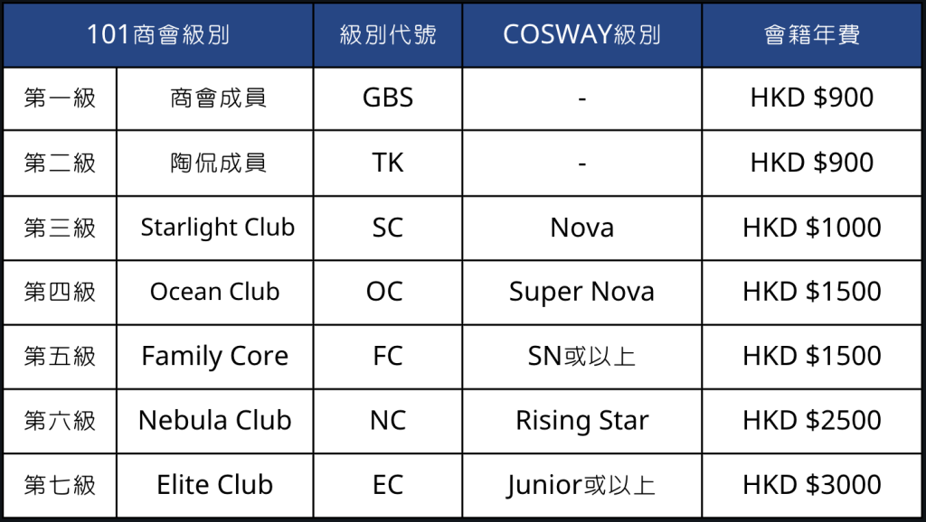 - 商會成員中,將按COSWAY職級分成不同級別,各個級別的成員均需繳交不同的年費去回饋商會;