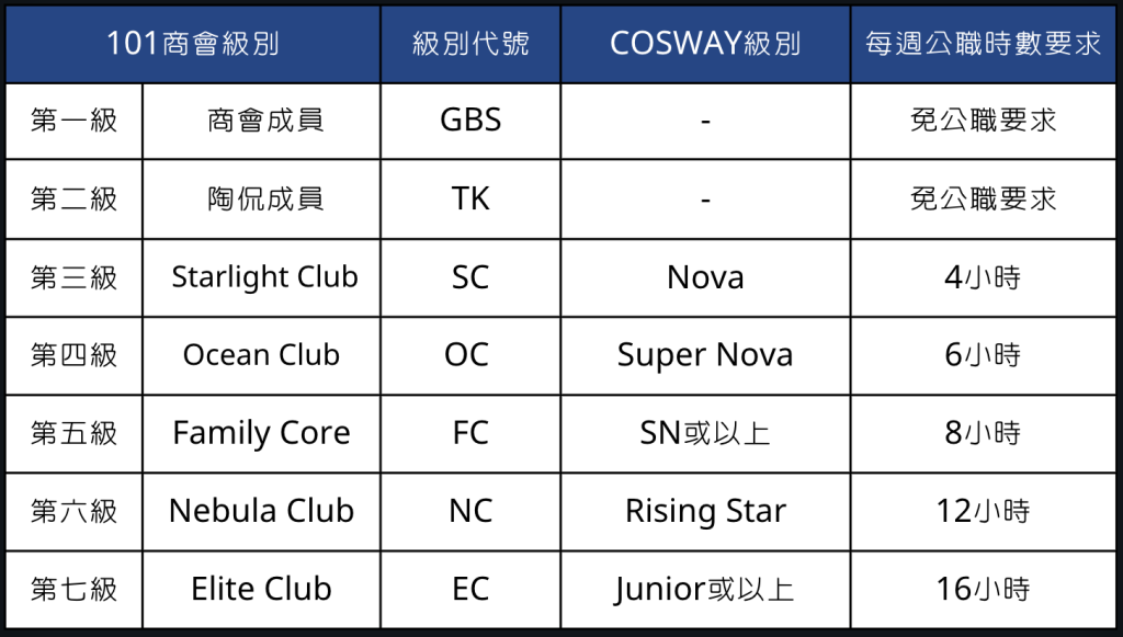 - 商會成員中,將按COSWAY職級分成不同級別,各個級別的成員均需承擔「每週公職時數」去回饋商會;